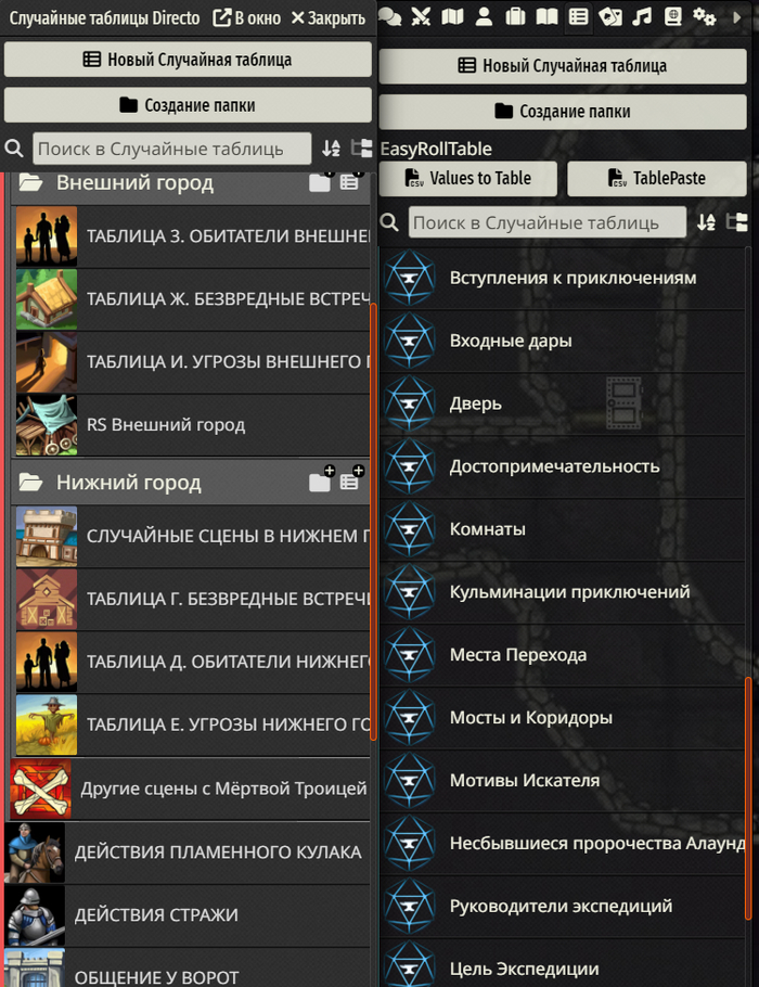 Все таблицы случайных событий не только созданы, но и заведены в отдельный журнал, для более простой навигации. Возможно позже я добавлю дополнительные макросы для быстрого броска сразу по нескольким таблицам.