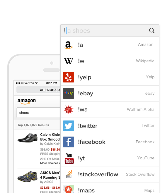 Достаточно написать в поисковой строке "!bang поисковая фраза" и поиск будет осуществлен непосредственно на желаемом сайте. Например: