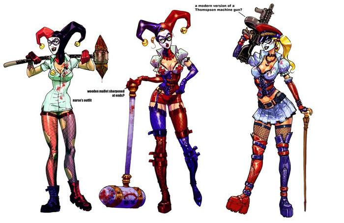В первой игре было легче оправдать смену одежды Харли, по сравнению с классическим образа. Идея была в том, что Джокер тоже собирался одеться скорее как сумасшедший доктор. Это первоначальная причина, по которой Харли одета как медсестра, — это вытекало из сюжета. Для второй игры я, кажется, сделал около десяти или даже больше различных вариантов дизайна, многие из которых были намного ближе к одежде из комиксов. Но, в конце концов, смысл был в том, чтобы гармонично объединить комикс-эстетику с образом Харли из Arkham Asylum.