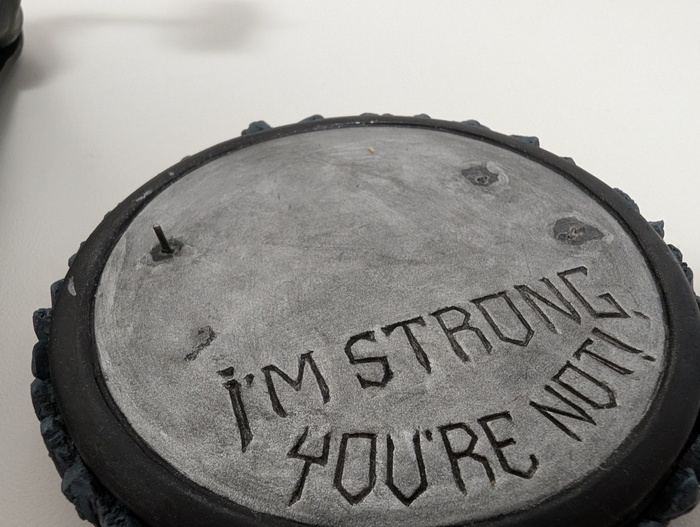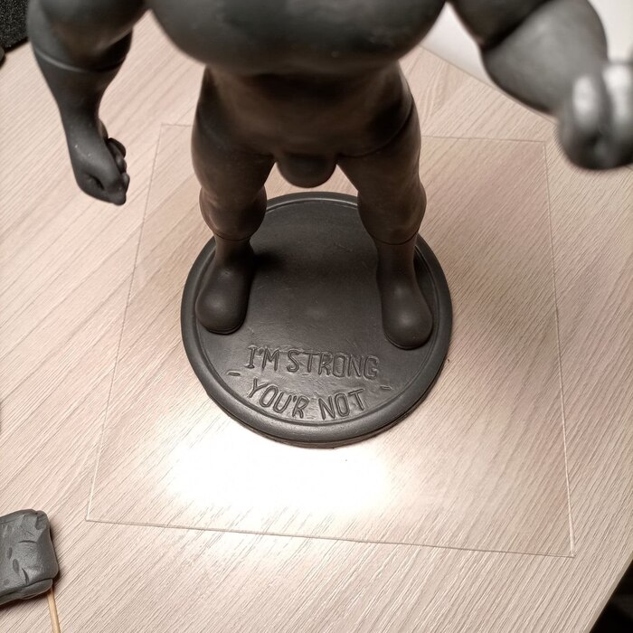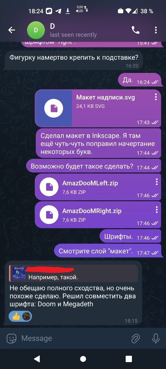 Далее автор вышел на связь 30-го декабря, скинул информацию и подтверждающие фото о том, что лепка фигурки BatMetal была завершена, а также скинул на согласование подставку. Выбранный автором шрифт меня не очень устроил, поэтому я сделал свой эскиз, и мы договорились, что он переделает надпись.