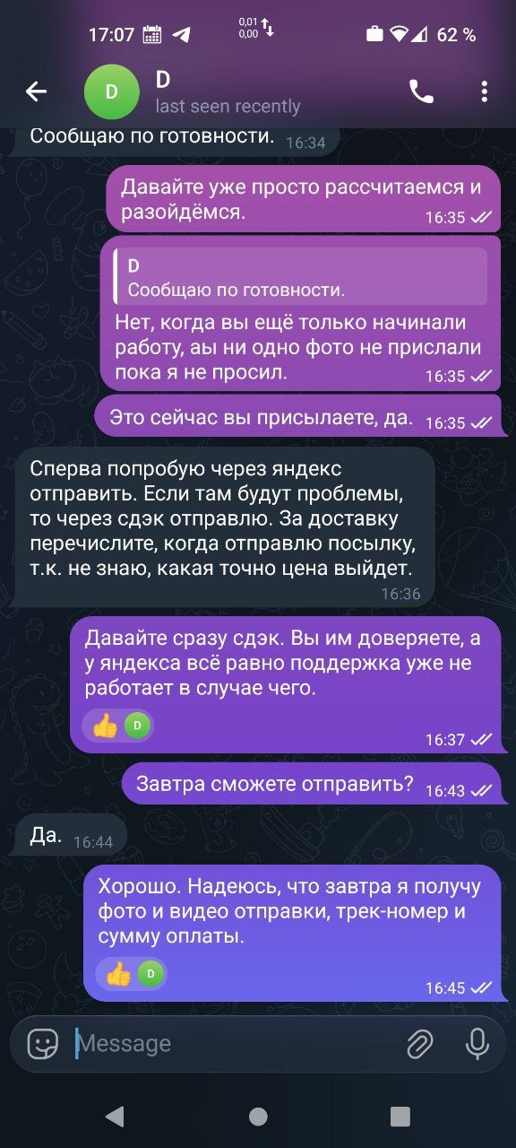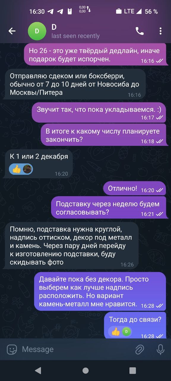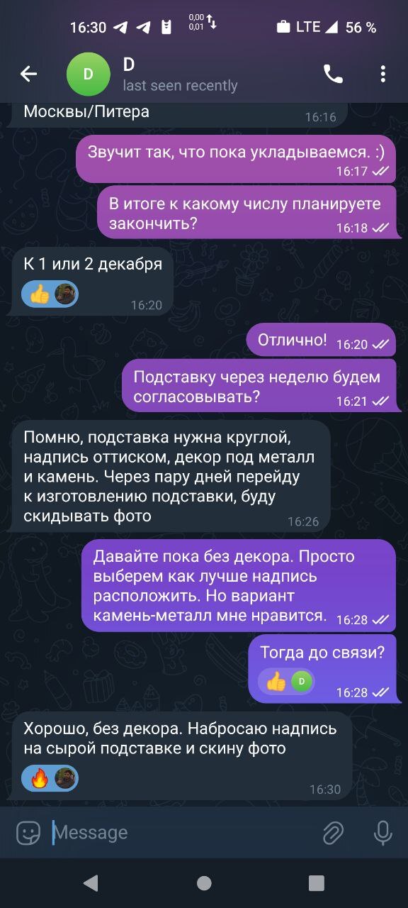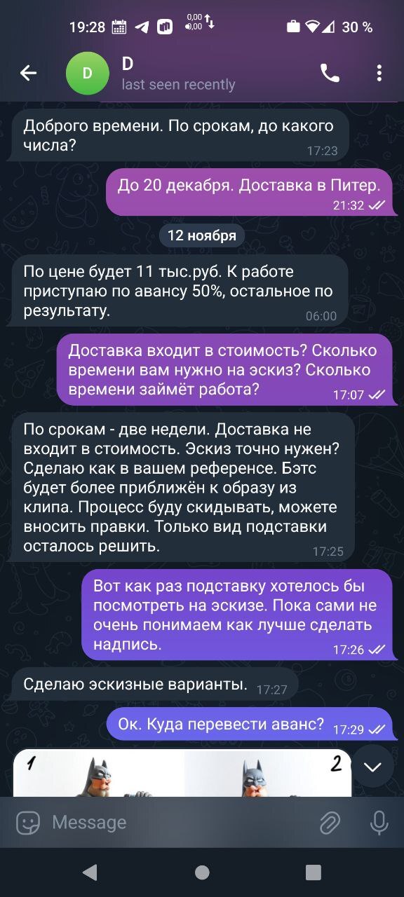 В ходе предварительного обсуждения об объёме и сроках работы выяснилось, что работа будет закончена уже через 2 недели, что было намного раньше необходимого мне срока, чему я очень обрадовался. Помимо этого автор пообещал присылать сообщения и фото о ходе процесса. Я со спокойной душой перевёл аванс и стал ждать.