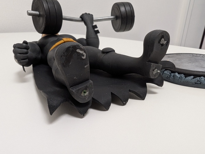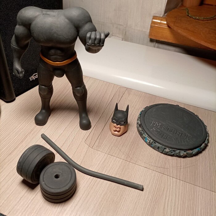 Далее я собрал все отвалившиеся части вместе, а также вставил разборную штангу в руку, чтобы посмотреть конечный результат. И, если абстрагироваться от всех проблем с заказом и сборки, то фигурка действительно выглядит круто. По художественной части автор не подвёл, и сделал всё отлично.