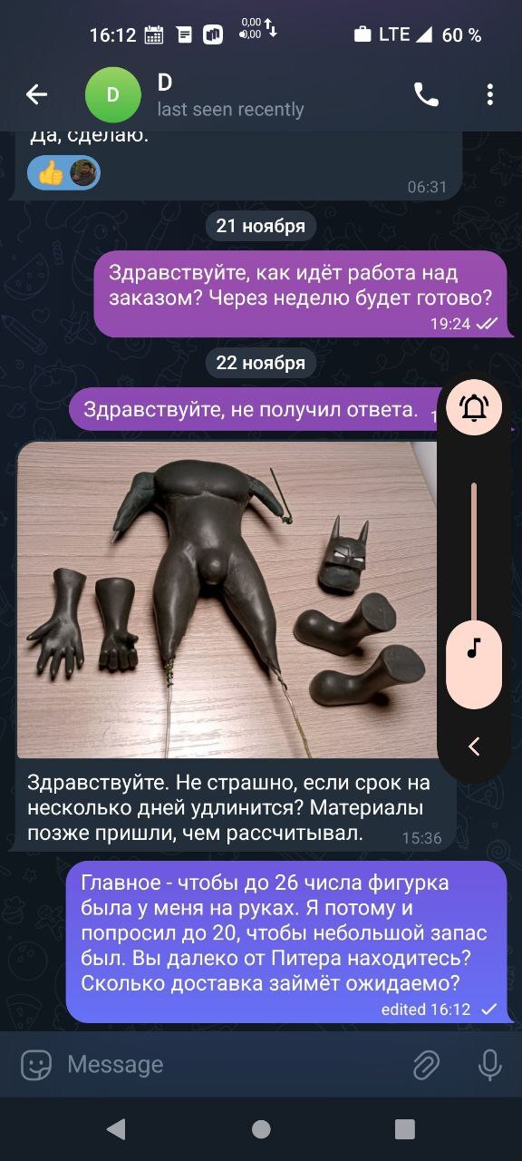 После этого прошло 9 дней, но от автора не было ни каких вестей, что меня начало беспокоить. попытался вновь связаться с ним, но в тот же день он мне не ответил, и до середины следующего дня я так же не получил никаких вестей, поэтому написал ещё раз. После этого автор наконец вышел на связь и предупредил, что сроки работы немного затянутся, т.к. материалы пришли позже. Новый срок 1-е или 2-е декабря.