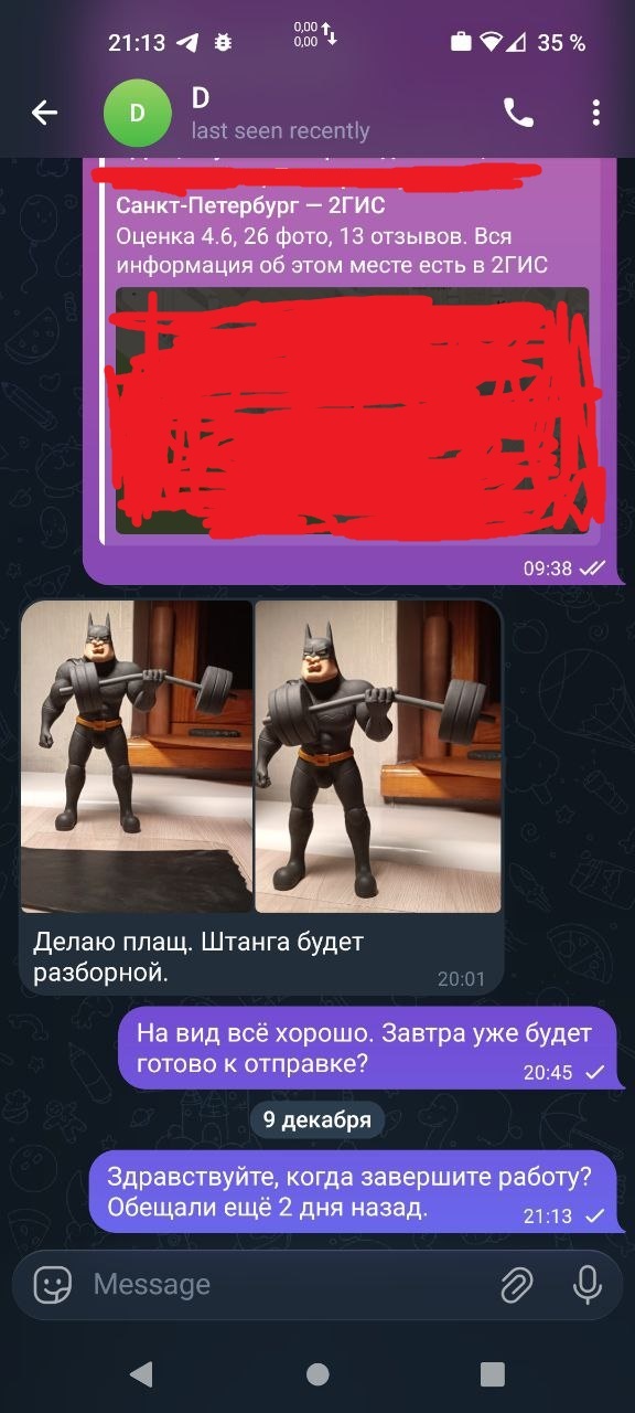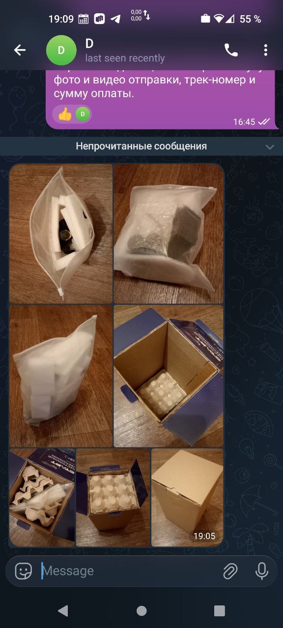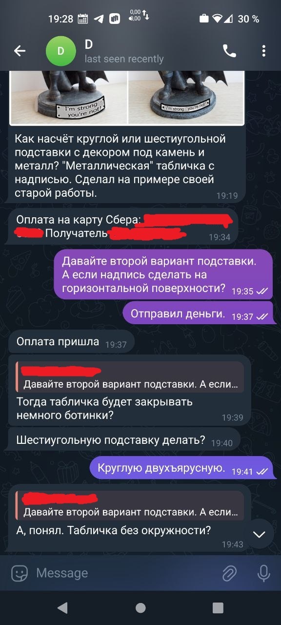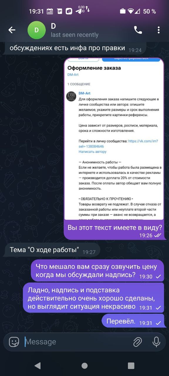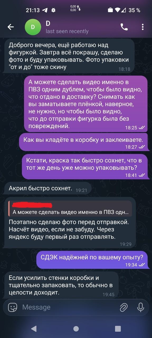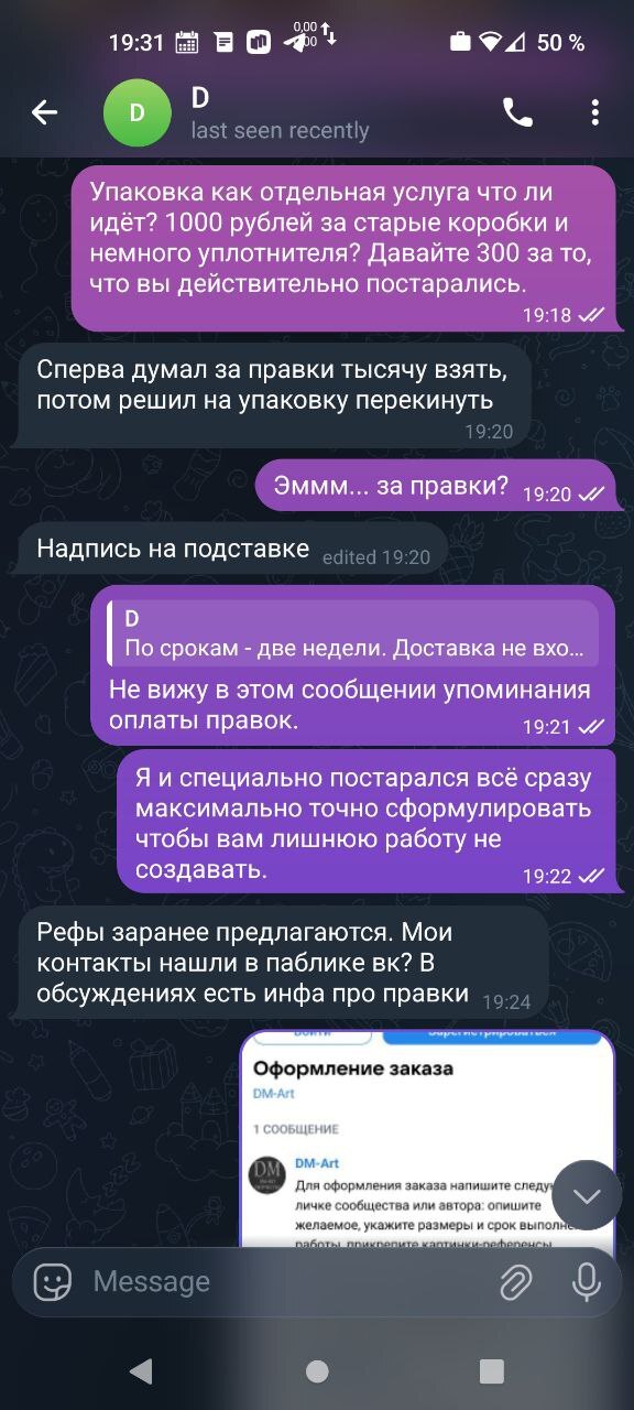 После словесного "волшебного пенделя" автор наконец-то соизволил всё упаковать. Упаковал он фигурку приемлемо, но тут выяснилось, что упаковка выходит в 1000 р. Я попытался выяснить, откуда набралась такая сумма, на что он мне сообщил, что в стоимость упаковки он включил стоимость работы за правки надписи на подставке, хотя ранее он вообще не озвучивал, что будет брать за правку надписи хоть какие-то деньги. И далее потом сослался на свою ВК группу, в которой я должен был прочитать, что любые доработки - платные. Вот так вот.