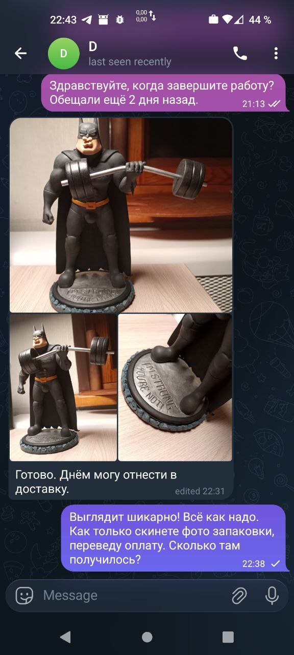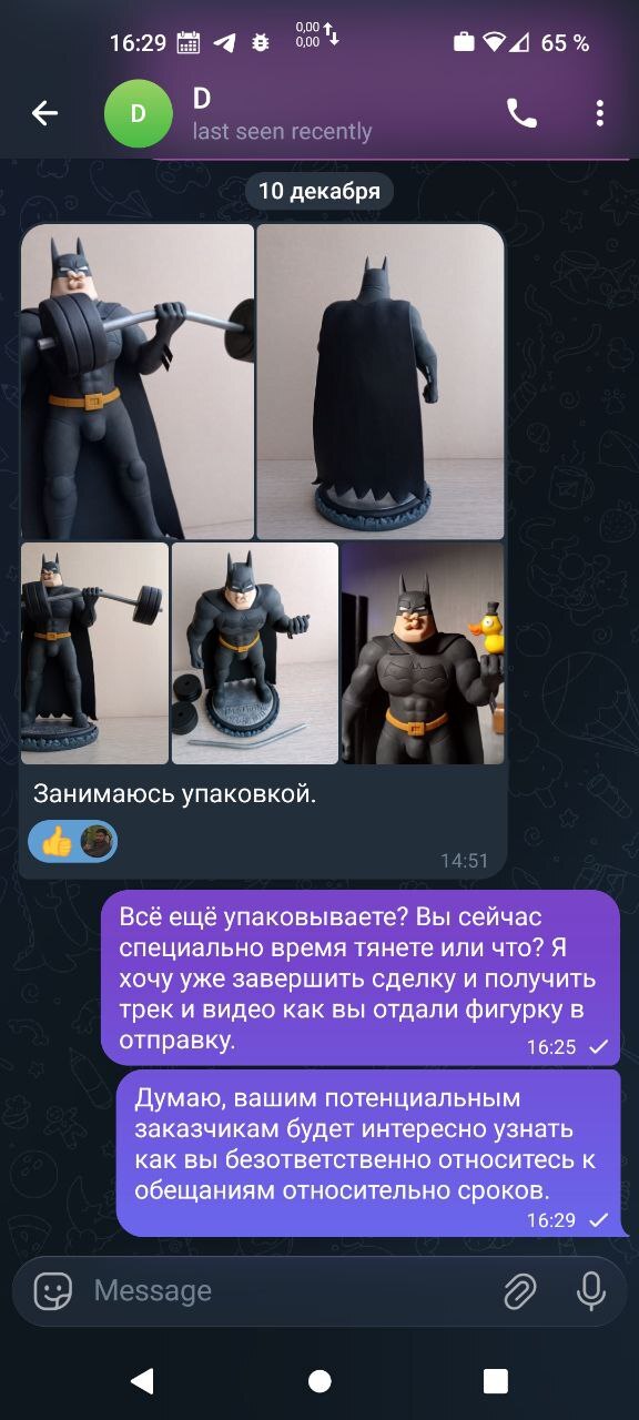 Что по итогу. Хоть автор действительно делает отличные красивые фигурки, которые могли бы занять достойное место на полке, но качество сборки и его отношение к процессу работы настолько отторгающее, что я бы ни в коем случае не рекомендовал что-либо у него заказывать. Но это только моё субъективное мнение и мой опыт, каждый решает сам.