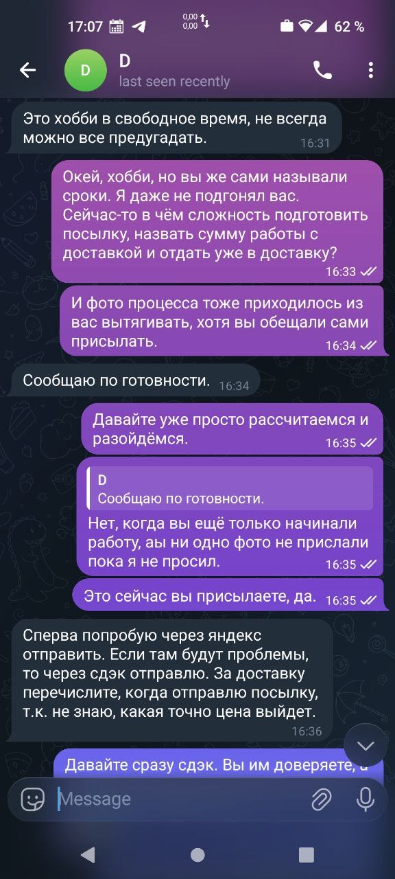 Но, как вы наверно уже догадались, 9-го числа ничего отправлено не было. И 10-го декабря я уже дал волю эмоциям, и решил высказать автору своё недовольство по поводу затягивания сроков, на что он парировал, что это всего лишь хобби, хотя он берёт за это реальные и весьма немаленькие деньги, а сроки, напомню, он назначал сам, но в итоге просрал, извините, пропустил их несколько раз.