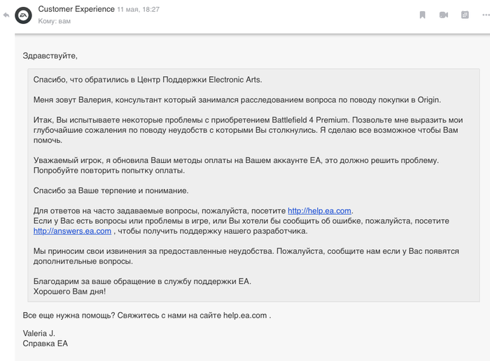 Получается, что это Триша, работник EA на минуточку, не может элементарно отличить арендованную за подписку игру от купленной в собственность. Ну думаю: "Ладно, я был груб и может не всё так ясно растолковал в пылу эмоций", написал ещё раз, объяснил доступно, как ребёнку и вновь получаю ответ от уже некого Алексея.