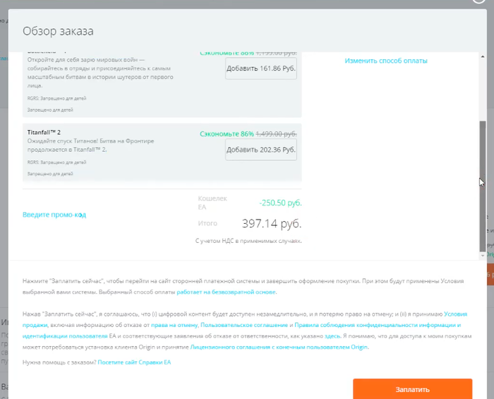 Решил я значит купить Battlefield 4 Premium в Origin, ибо кончалась халявная подписка Basic, ну и как раз пошла отличная акция. В кошельке EA лежало 250 руб, оставалось добавить чуть меньше 400 руб с карты и приобрести. НО! Оказывается, один из крупнейших магазинов цифровой дистрибуции в мире, не умеет простое действие, а именно совершить оплату одновременно новой картой и кошельком. Кошелёк отдельно тоже нельзя пополнить на определенную сумму (только подарочная карта), привязать отдельно карту и потом оплатить вместе с деньгами кошелька тоже нельзя (карта привязывается при первой оплате любого продукта), но так как я не хотел хранить данные карты, то у меня привязка отменялась при покупке.