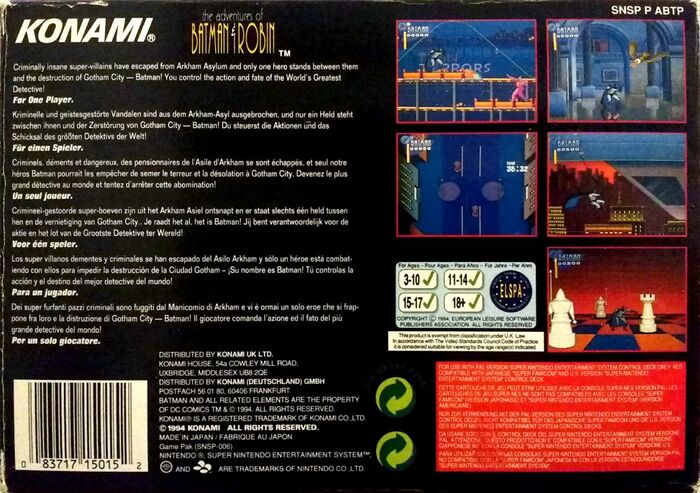 7, 8, 9. Три разноплановых игры с заголовком The Adventures of Batman & Robin (1994 / 1995) для SNES, Sega Genesis и Sega CD. Достаточно вариативный платформер, beat 'em up с помесью shoot 'em up, аркадная гонка с прятствиями и кат-сценами, в сумме представляющих собой отдельный эпизод мультсериала.