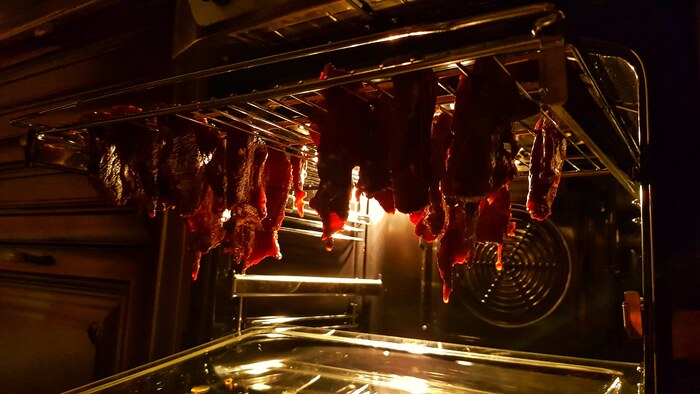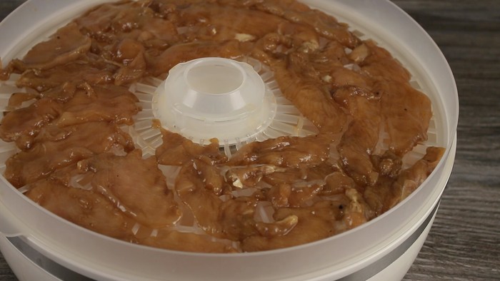Первый час при температуре 70°С. Примерно на сороковой минуте лучше перевернуть мясо и поменять этажи сушилки местами.