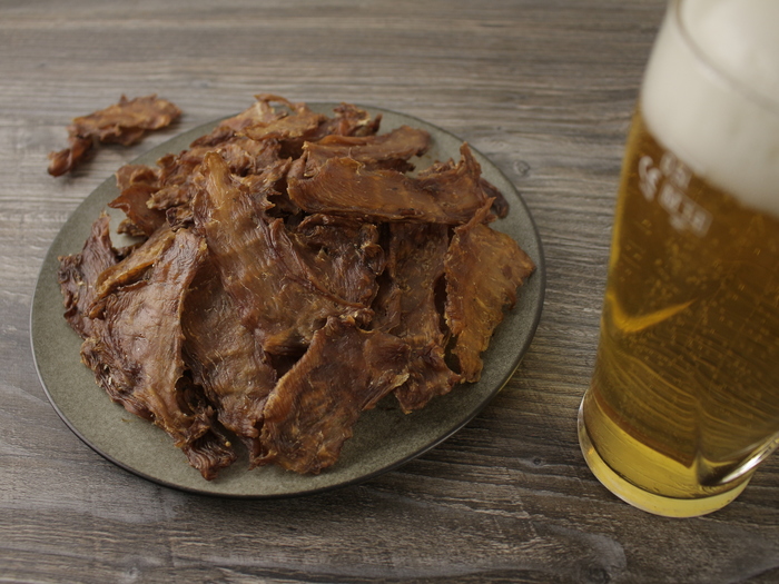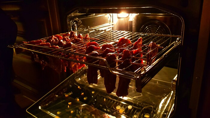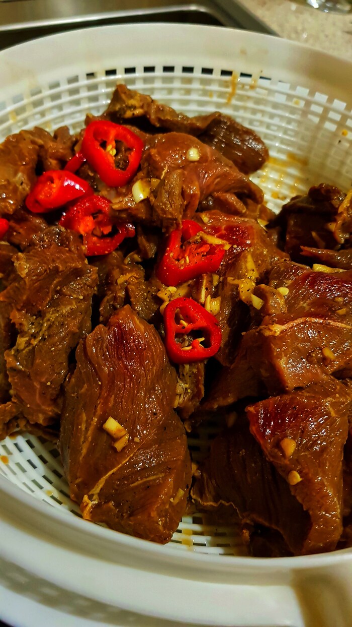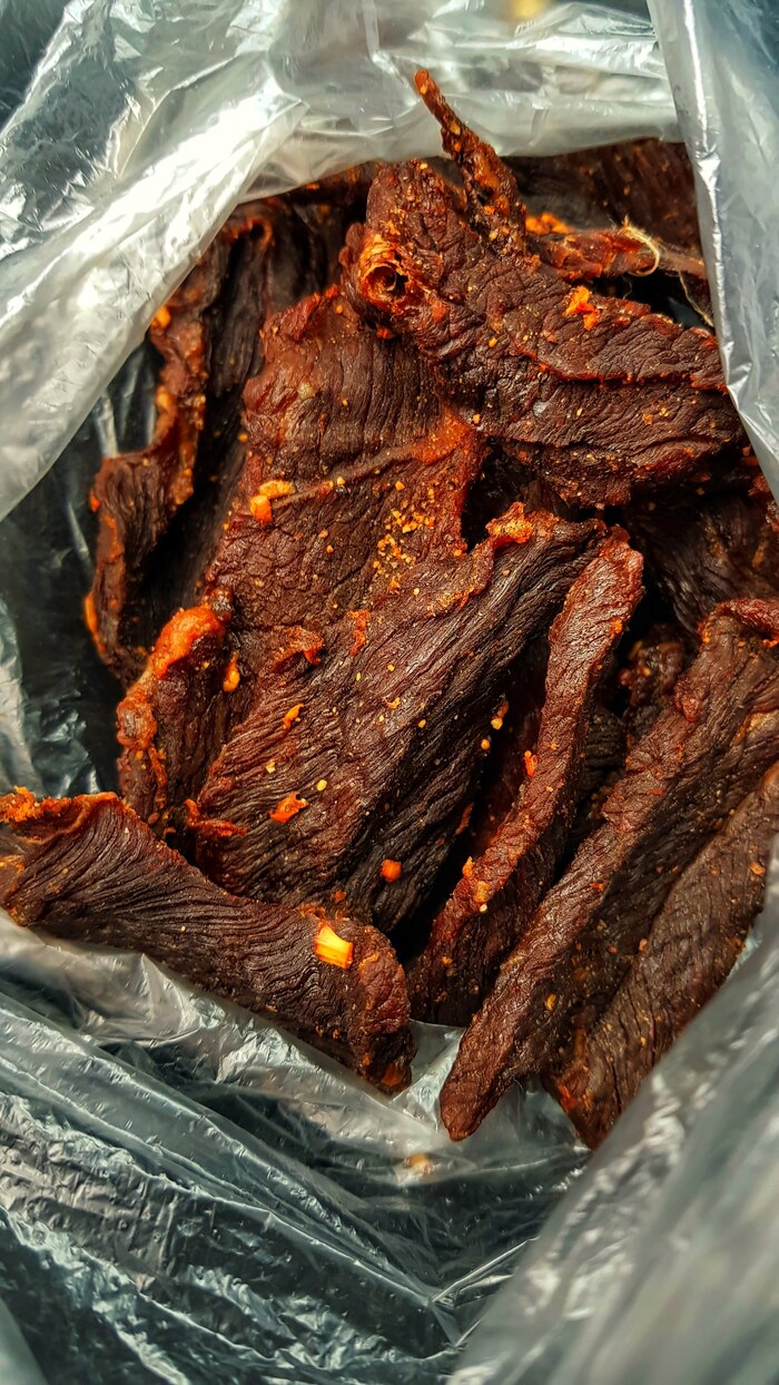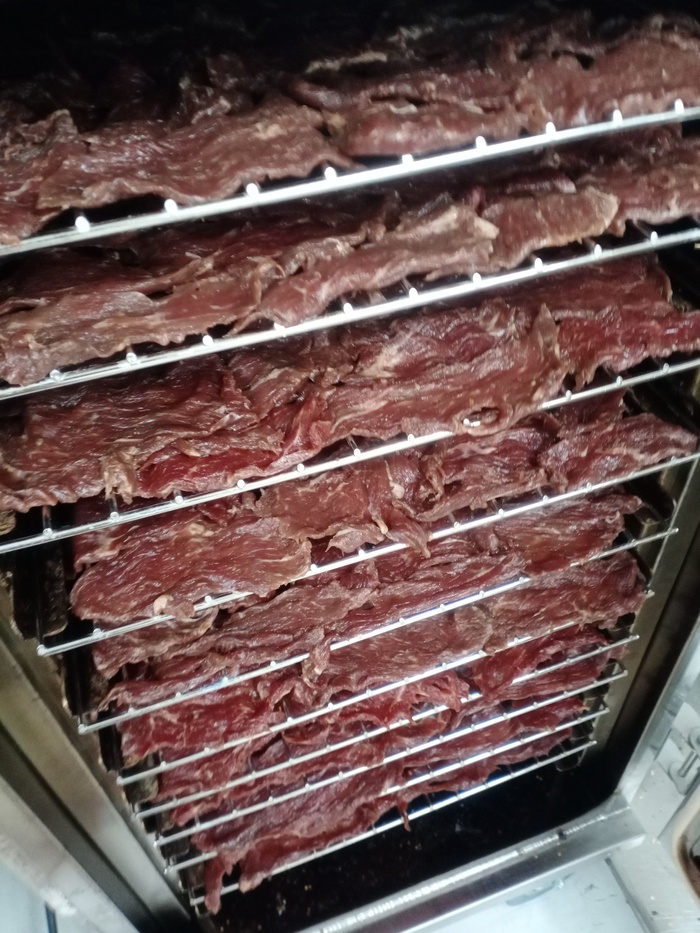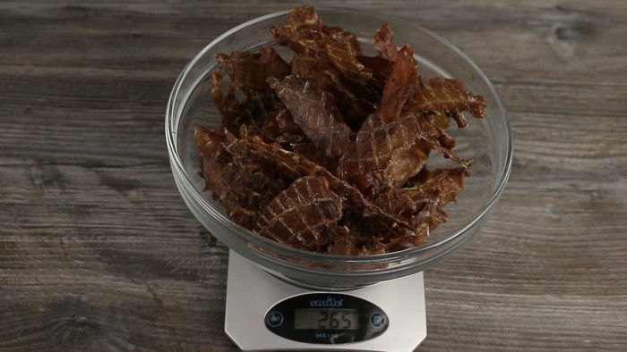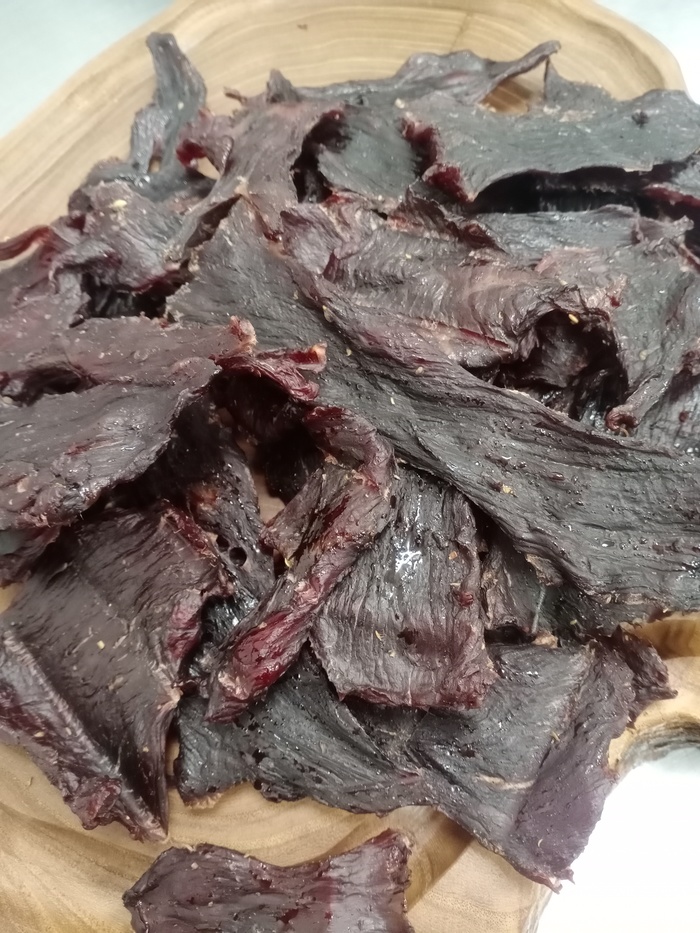 Усушка составила 60% Джерки ещё эластичные но уже на грани, можно уменьшить время сушки при 60°С на час и будет как хорошо провяленное карпаччо)