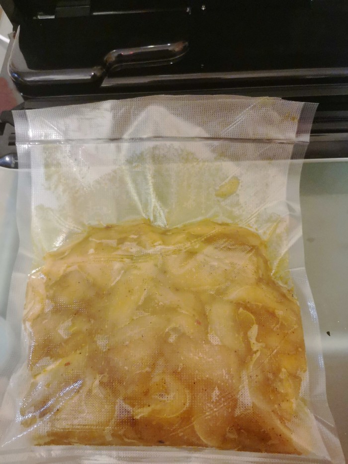 Все время пока собирался готовить я думал над маринадом, и не могу понять почему на производство мясных чипсов никто не использует нитритку? Причём не нашёл ни одного рецепта ни говядины ни свинины ни курицы! Почему? И решил экспериментировать, с учёта усушки взял 1,8% нитритной соли, далее пару чайных ложек терияки, чайную ложку соус Чили имбирный, чайную соуса Чили сладкого, чайную кари, чайную приправы для курицы и немного молотого душистого перца. После замеса маринада, показалось что переборщил с перцем ( но по факту окажется все норм). Замешиваем курицу и отправляю в вакум мариноваться на 12 часов