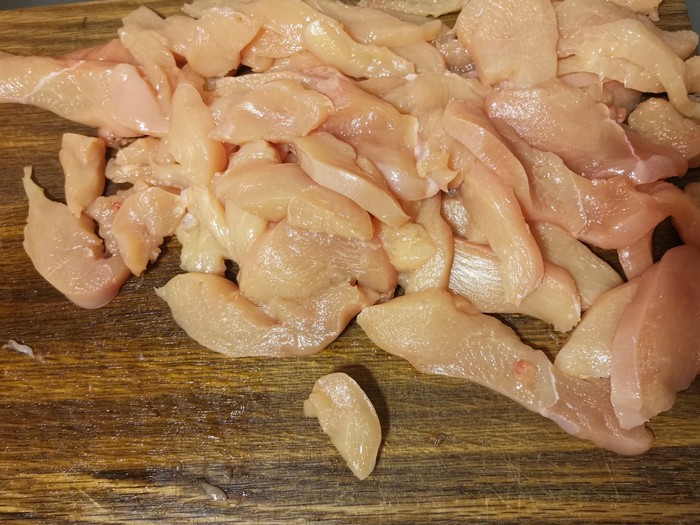 Убираю кожу и аккуратно снимаю филе. Филе режу на тонкие полоски вдоль волокон.
