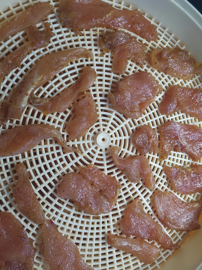 Через час вынимаем мясо, и выкладываем его на сушилку для овощей. В сушилке включаем режим обдува и нагрев. У всех сушилки разные, но думаю нагревают в диапазоне от 55-60 градусов. Я Оставил в таком состоянии примерно на 9-10 часов.