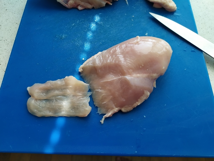 И отправлены в морозилку на подморозку, дабы легче было нарезать, прождав 20 минут и не дождавшись нормальной подморозки грудки достал и как-то нарезал, толщиной по 5 мм примерно
