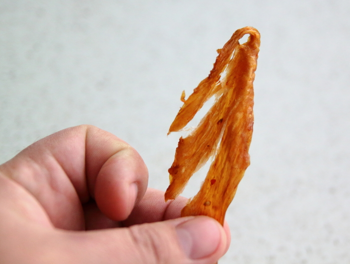 Мясо получилось упругое - структура напоминает колбаски кабаносси, паприка добавила легкий копченный вкус, пересола нет, именно столько сколько нужно. Жуется намного приятнее чем чипсы из говядины, а времени ушло не намного больше чем просто порезать говядину.