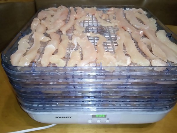 Включаем сушилку в сеть и сушим мясо с каждой стороны 3-4 часа.