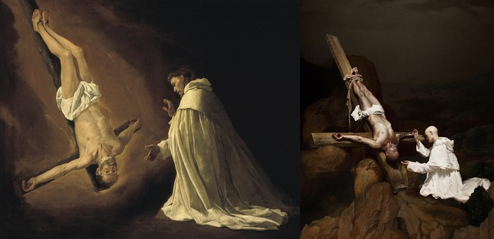 Работа "испанского Караваджо" Франсиско де Сурбарана. Тут изображен святой Петр Ноласко, удивленный появлением в своей строгой келье своего святого заступника, апостола святого Петра, который предстает вниз головой, таким образом, как он был распят, чтобы утешить святого, который не смог посетить могилу апостола Петра в Риме, а также поддержать его и воодушевить на продолжение своей апостольской миссии в Испании.