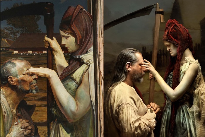 На фоне села и полей, ночью появляется девушка с косой, символизирующая ангела смерти. Для Мальчевского смерть - это освобождение от земных забот и жизненных невзгод, поэтому старец на картине полон доверия к девушке, а та в свою очередь смотрит на него с любовью и состраданием.