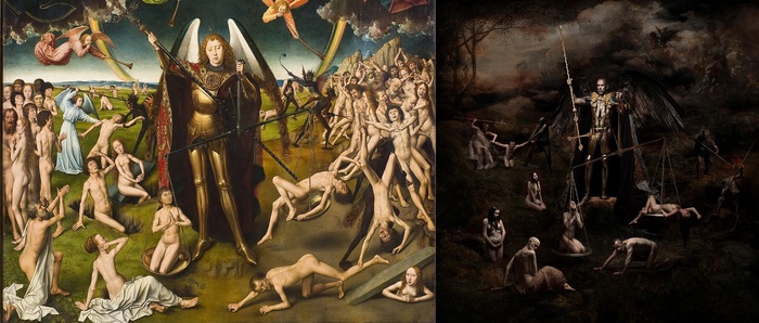 На фрагменте изображен архангел Михаил в золотом сиянии лат, взвешивающий души умерших. Посохом он ранит душу справа и сбрасывает ее в ад (то же самое можно увидеть во всей красе в клипе Behemoth "God=Dog").