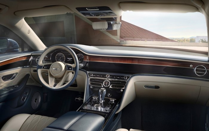 Так как это лакшери сегмент, стоит начать со слов об интерьере. Больше всего привлекает внимание широкая горизонтальная фанера, которая является центральной частью всей приборной панели и даже дверей. Она плавно переходит в центральную консоль, которая включает в себя вращающийся 12.3-дюймовый сенсорный HD-дисплей, который можно доукомплектовать тремя элегантными аналоговыми циферблатами, и новые центральные кнопки. Одной из инноваций является место для индуктивной беспроводной зарядки телефона, а для «бедняков» имеется два разъема USB для обычной зарядки. Но дальше круче, ведь новый Flying Spur первый автомобиль в мире, который используют трехмерные вставки из стеганой кожи с алмазами, идея который была начата ещё в концептt Bentley EXP 10 Speed 6. Также есть алмазное покрытие кожи (на самом же деле так называют лазерную обработку кожи). Доработан и комфорт для пятой точки, так как сиденья в FS абсолютно новые, с повышенной функциональностью, включая обогрев, вентиляцию, многорежимный массаж. Благо все остальное в интерьере уже знакомо из Continental GT 2018.