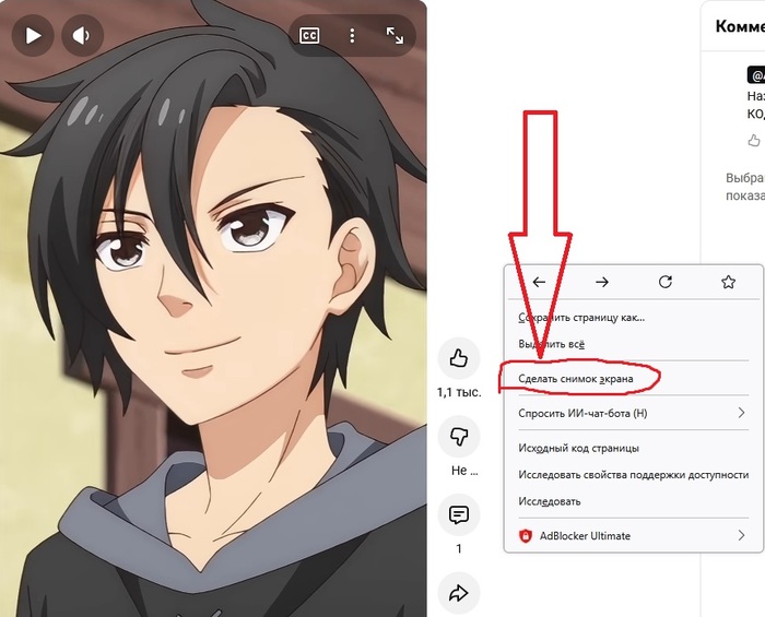 1) Тыкаем мышой в любом месте страницы хостинга, только не на само видео. И выбираем сделать снимок экрана. Это позволяет довольно удобно вырезать скрин только самого видео.