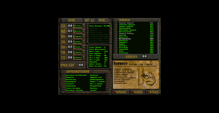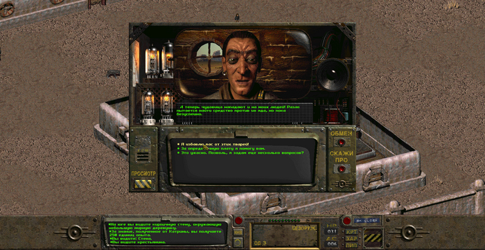 2. Ну ладно, это я с козырей зашёл сразу. Думаю сердце накрыло ностальгией. Но чем ещё запомнился Фаллоут 1? Конечно же вот этим. Смешно было делать персонажа тупо неандертальцем, а потом читать вот такие диалоги