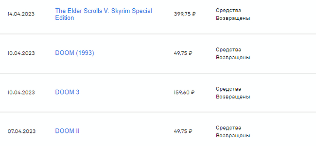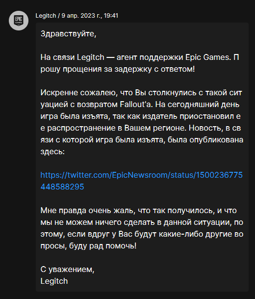 Как указывают пользователи, при изъятии игры оформляется принудительный возврат с предоставлением уведомления, в котором не уточняются причины возврата. DTF предполагает, что игру изымают по запросу её разработчика, компании Bethesda, в начале марта 2022 года прекратившая продажу своих игр в России.