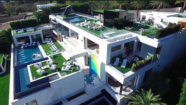 В доме есть 13 спален, 25 туалетных комнат и 3 кухни.Заметили странность? Почему-то туалетов не 26, видимо один из гостей никто не приедет с парой, ну да ладно. Это еще не все как вы догадались. Кинотеатром, боулингом, спа-салоном, массажным кабинетом, спортивным залом, винотекой, баром и бассейном, с невероятным видом на город, уже никого не удивишь, хотя многие спросят: “ А есть ли подвальчик, соления там хранить и картофан,например?”