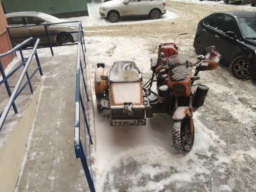 Честно говоря, сам путь до Тольятти оказался скучен и обыден — такого шквала впечатлений я не получил, как по пути на Самовар-2015. Да, была радость путешествия и особенно — удачной конструкции пневмоподвески на коляске, благодаря которой я избавился от увода колясыча с прямой траектории. Думаю, основная радость и была связана с пневмоподвеской — РАБОТАЕТ, ЧЕРТ ПОДЕРИ! Наконец-то я покорю Зимнюю ЖЖ, делов то теперь 1600 проехать за сутки! Был, разумеется мандраж — это все-таки зима! И отдельно волновался за мотоцикл — я залил обычное автомобильное масло Мобил 0w30 и каждый чертов раз, когда колесо срывалось на гололеде, мое сердце замирало… Каждый чертов раз, хотя я понимал что это гололед и чувствовал снос! А гололед был первые 1500 км… И особенно жопочный — от Тюмени через Курган до Челябинска. Эта дорога была самой трудной на всем протяжении, т.к. каток был сплошной и ехать было и трудно, и страшно…