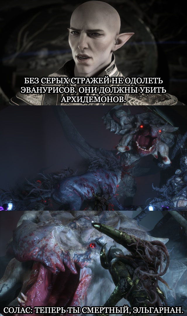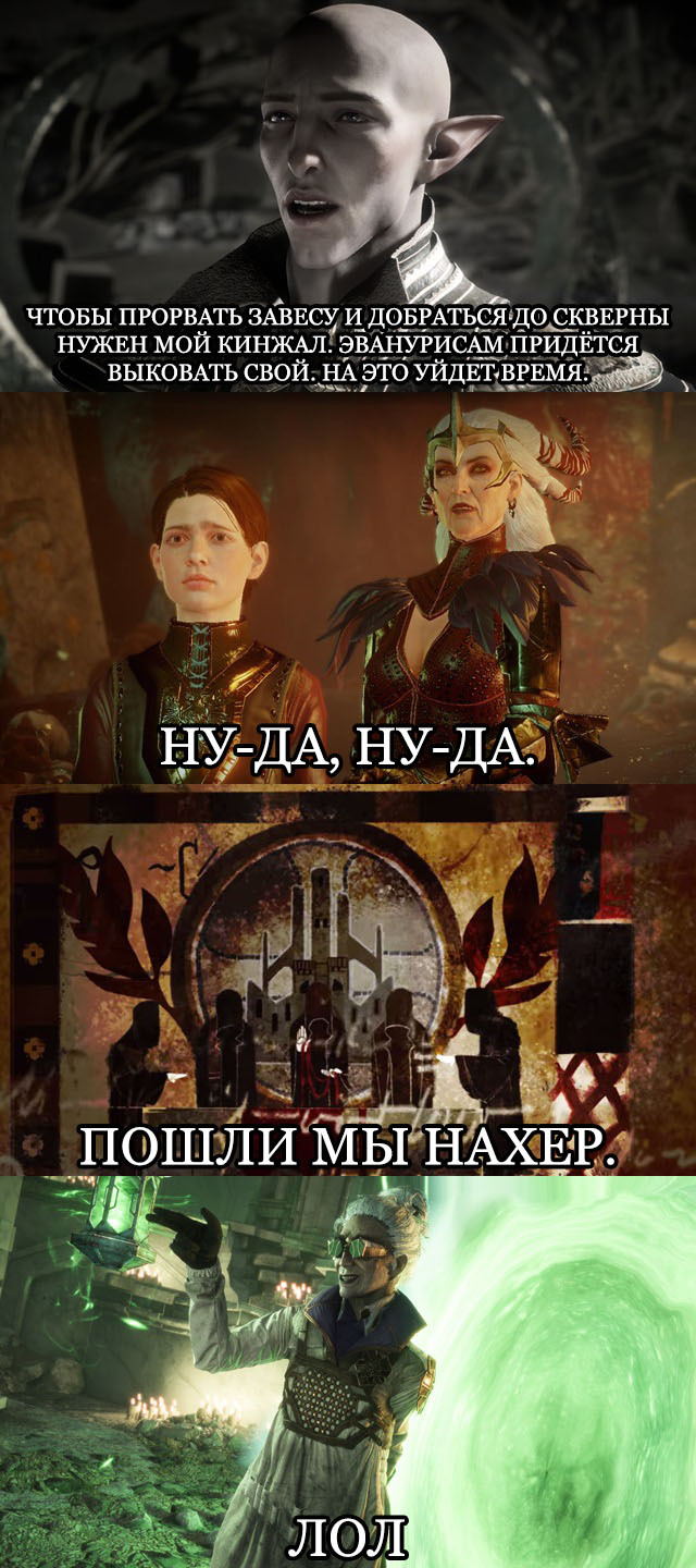 В целом игра понравилась, но я определённо не стану переигрывать в неё раз 20, как в предыдущие части. Может разок ещё перепройду позже, заромансю Даврина и убью Хардинг((( Ыхы. Но хотелось бы посмотреть на его и Ассана счастливый конец тоже. Жаль, что нет возможности спасти всех, и Варю особенно. Зато все остальные живы, мы победили, Солас(солянка его называла все время в Инкви)) ушёл в Тень сам. Грифоны с эльфами в Арлатане тусуют. От скверны всё как могли очистили. Гг моя романсила с Луканисом. Такие пироги.