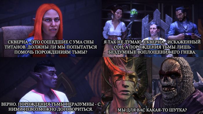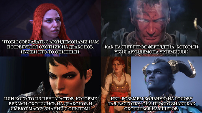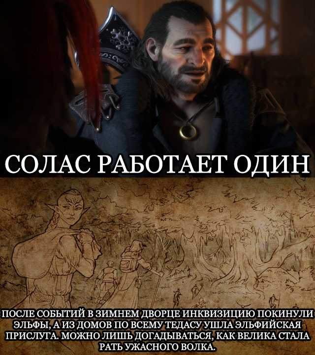 Спутники сначала не казались такими родными, как из старых игр, но это только вначале. А Варрик вообще родня. Братец! Так была рада его и в этой игре видеть. Как меня передёрнуло, когда его ранили и какое облегчение было, когда он выжил...Ага. Ну об этом потом.
