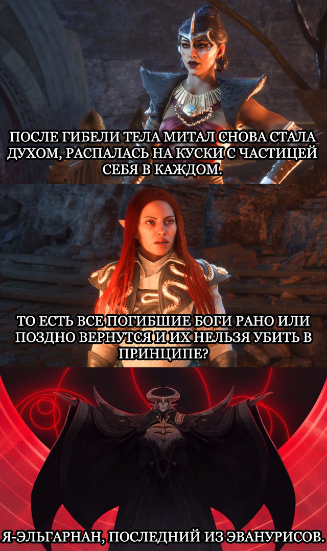 Эмоции главной героини, её живое лицо, мне очень понравилось. И раскрытие лора этого мира супер просто, хоть и возникла какая-то грусть по поводу всей этой истории с богами, титанами, но это грусть не потому, что ято-то не так как хотелось бы, а что-то вроде того, что вернувшись в первую часть, я не смогу так как раньще воспринимать упоминание богов типа Эльгарнана и Гилланнайн, а скорее со злостью и разочарованием. Я очень проникаюсь игровыми историями, как и фильмами и книгами, проживаю их.