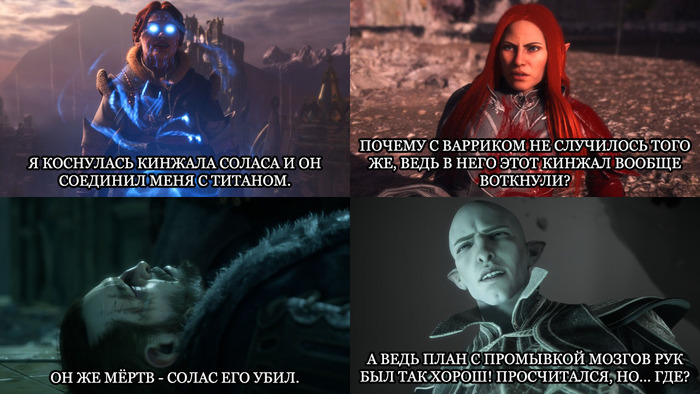 После этого гг попадает в тень и тут тебе новый удар под дых... Варрик оказывается умер ещё вначале! Я ещё когда трейлер увидела, где Бьянка разбилась и возникла мысль, подумала, что если Варрик умрёт, не буду играть в 4 часть больше вообще. Но тут схитрили разрабы, не показали сразу, что он всё... Я отходила потом несколько дней. Какое-то опустошение было. теперь хочется перепройти старые части, где Варя живой. Это просто удар ниже пояса. Я понимаю, не всегда всё радужно должно быть, а в жизни так тем более, но в игру захожу всё таки не за стеклышком))) В общем было очень грустно.