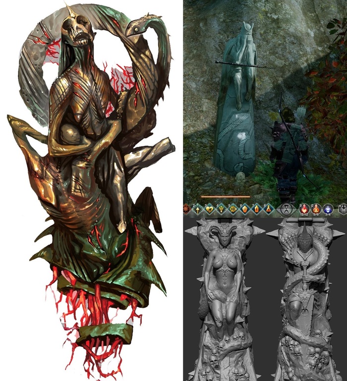 Чем Солас заманил эванурисов в Глубокую Тень? Древним богом принадлежавшим Митал. Также он поступил с Забытыми, которых ждала иная ловушка. Когда она захлопнулась Гельдауран, Даэрнтал и Анарис оказались лицом к лицу с освобожденным от темницы драконьего тела древним духом. Он был в своей естественной материальной форме огромной змеи с шипами (барельефы в тевинтерских строениях, статуи косситки и воина империи в основании руин древнего моста у Сарнии). Древний бог обхватил их кольцами своего тела и всех залило лириумом. Так появился идол из красного лириума, что века спустя найдет Хоук в Первозданном тейге, охраняемом высшим драконом. Потому что запирать Забытых в Бездне, куда теперь течет сила Камня, было бы глупостью. Гномы пленили Намврелиса в лириумной сфере окропленной кровью воинов. Каридин заточал души гномов в големах и Наковальне Пустоты. На коцепт-арте идола лучше видно существо обхватывающее 2 мужских фигуры и одну женскую с эльфийскими ушами. У женщины при этом из глаз, носа и рта течет черная жидкость. Также было с Первым чародеем Ремийе в «Призыве», когда он пользовался магией скверны. Шепот из красного лириума в Тени гласит «мы разбиты». Коул говорит, что его песня злая и идет из-за двери, которую хотят открыть. Солас мог разделить сущность Забытых на несколько частей и спрятать в разных местах. Чтобы избежать их освобождения. Дракон же отгонял от темницы живых существ, чтобы красный лириум не разрастался. Путь в Бездну Солас очевидно перекрыл, чтобы новых Забытых не появилось пока он будет в утенере. Судя по жилам здорового синего лириума перед входом в Первозданный тейг, последний расположен над спящим титаном. Он также подавлял распространения опасного минерала. До того как Хоук и компания не убили дракона и унесли идол на поверхность. Тогда туда пришли порождения тьмы, авантюристы, Серые Стражи, Бьянка Даври и Хартия по заказу Корифея.