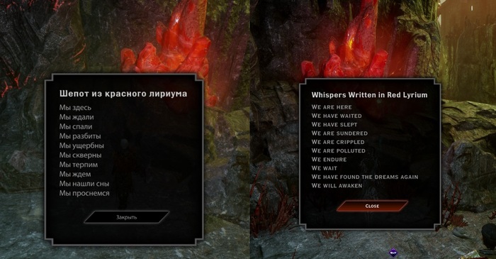 В некотором роде история повторилась. Кризис веры в империи и гражданская война спровоцировали попытки жрецов дозваться до Древних богов. Об этом писали последователи Разикаль в Морозной котловине. Они построили там храм на месте силы. Гурд Харофсен отмечал, что древняя часовня чадит магией, а под ей была эльфийская комната. На стене которой был выбит «манифест» Гельдаурана — одного из Забытых. Жрецы нарушили запреты и устраивали кровавые жертвоприношения, чтобы связаться со своей богиней. А дозвались до Забытых. В DAO был квест по привязке мест силы к конкретному магу. Гельдауран видимо тут это и проделал в древние времена. Шепот из красного лириума включал строчку «Мы снова нашли сны» (в нашей локализации слово «снова» куда-то пропало при переводе). Забытых уже пробуждали, задолго до злополучной экспедиции Хоука и братьев Тетрас в Первозданный тейг. В пользу этой версии говорит то, что перед бегством из Морозной котловины жрецы заморозили храм. Коул в Эмприз-дю-Лион и у лагерей красных храмовников в иных локациях говорил, что красный лириум не жжет так сильно злобой когда холодно.
