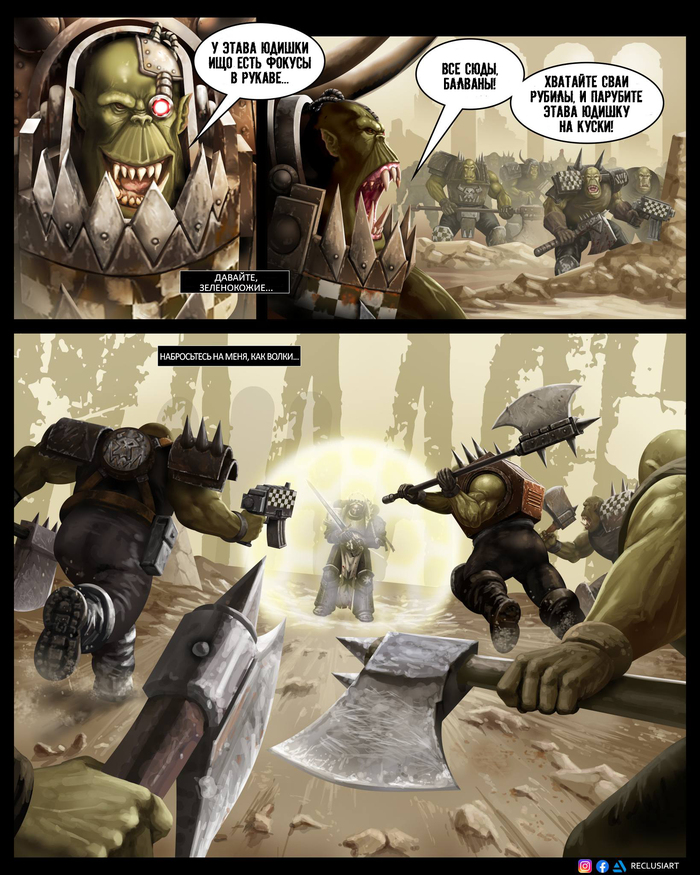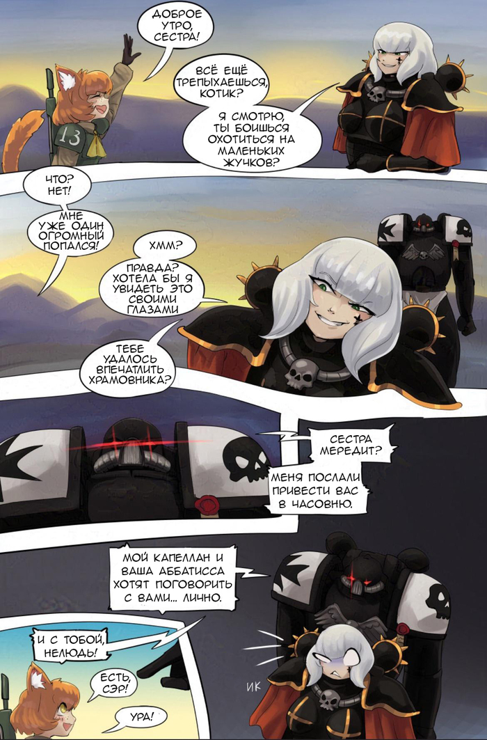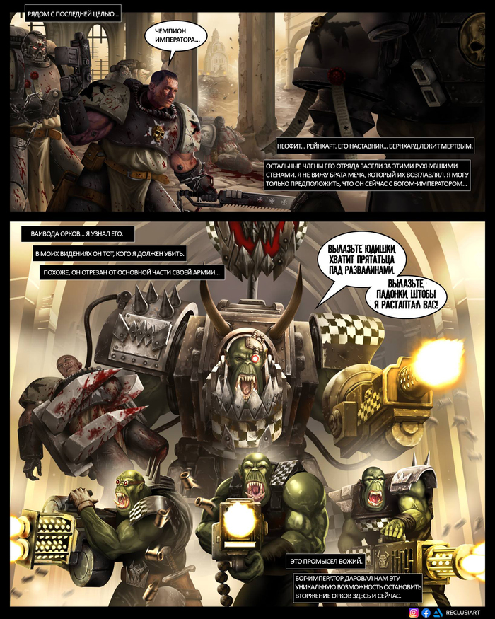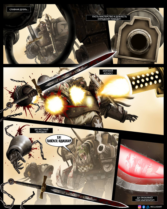 – Пусть Его свет ослепит моего нечестивого врага. Пусть Его свет явит мне врага. Я – сын Рогала Дорна. Я – избранный Императора. Я – сосуд Его мудрости и мести. Я – космический десантник Чёрных Храмовников, Адептус Астартес, и я не ведаю страха.