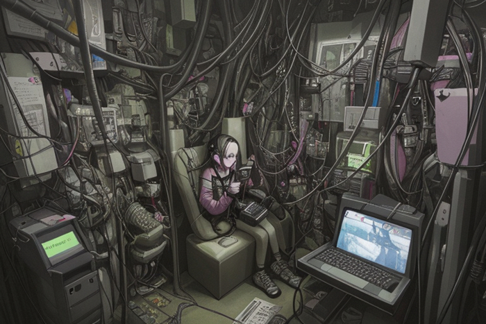 Prompt: high-tech distopia. people suffer. they are bounded with cables of their mobile phones