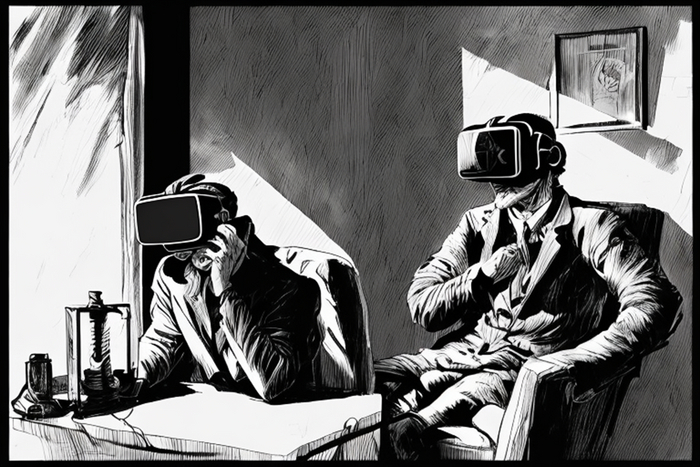 Prompt: Dying man sits in a chair with VR helmet on his head