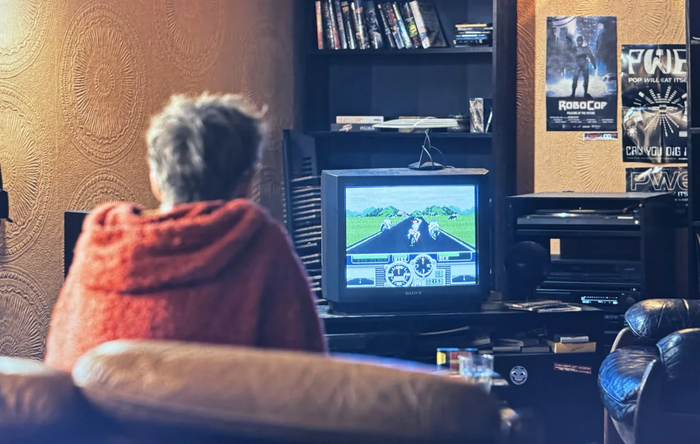 🔸 Road Rash и PWEI: Лампа позже играет в Road Rash на Mega Drive. А постеры группы Pop Will Eat Itself (PWEI) на стене – тоже отсылка! Эта группа звучала в игре Loaded на PS1, а их обложки и логотип создавали те же The Designers Republic, что подарили WipEout его фирменный стиль. Рядом на полке виднеется коробка Alien Storm (Master System) и игра от Ocean Software.
