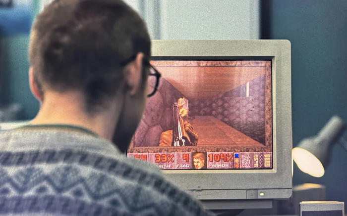 🔸 Сетевой Doom II: Молодого Уокера показывают играющим по сети в Doom II в офисе журнала PC Zone.