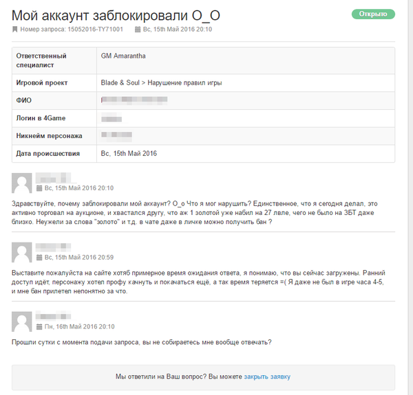 Начну с предисловия. 13 мая текущего года наша любимая компания-локализатор Иннова должна была запустить игру Blade and Soul, её ждали многие включая меня. Я играл уже в других локализациях, и хотелось бы наконец поиграть на официальном русском сервере, я даже приобрёл Гуру-пак за 2500 рублей. И когда старт провалился и был откат прогресса и перенос старта на 14 число, я не выл и не ныл, всякое бывает, не видел я ещё идеального старта, даже у Близзард косяки были постоянно. Да и не об этом сейчас. 14 числа я наконец стартовал, прокачал персонажа, никаких проблем не было, поднял 27 уровень. 15 числа так как я работал, я не мог поиграть нормально, но на ноуте зашёл в игру и потихоньку качал крафт, благо он много времени не отнимает, и периодически переписывался с другом. Далее вышел из игры на несколько часов. Вернулся и получил следущее сообщение.