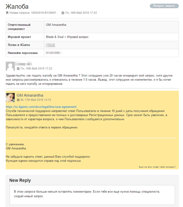 Тут видно ответ от того же сотрудника. Почему он сам рассматривает запрос на жалобу на него же? У фогейма нет больше ГМов? Почему такое наплевательское отношение к своему клиенту? Как на это вообще можно повлиять? Увы желания играть в их игры больше нет. Даже обратиться никуда не получится, ибо по пользовательскому соглашению всё точно расписано, я как игрок не владею аккаунтом, и они могут без выяснения причин его закрыть.