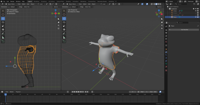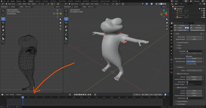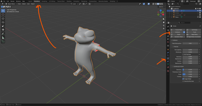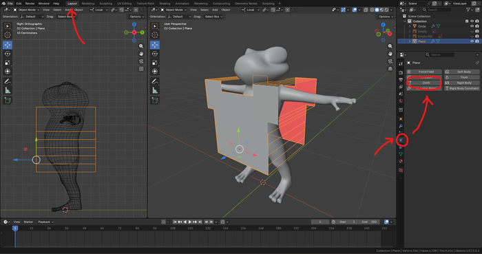 Перехожу во вкладку Layout и в режиме Object Mode сначала выделяю персонажа и во вкладке Physics кликаю на Collision.