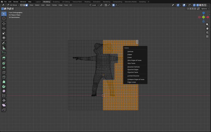 В Виде спереди (1 на NumPad или ~(Ё) > Front) , в режиме отображение сетки (Z > Wireframe) выделяю и удаляю (X > Faces) Лишние полигоны.