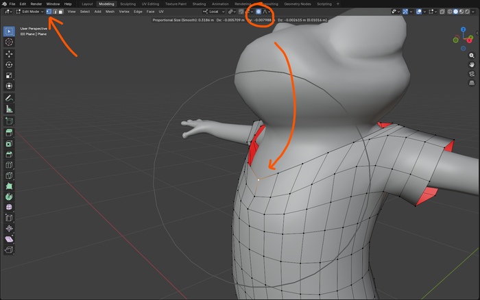 В верхней части программы выбираю Proportional Editing, выбираю нужную вершину и подгоняя размер области действия модификатора колесиком мыши, формирую воротник.
