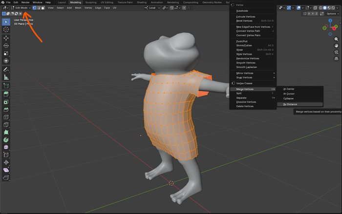 Выбираю модель одежды, перехожу в Edit Mode, выбираю режим выбора вершин (1 на клавиатуре), жму в свободном месте правой кнопкой мыши и выбираю Merge vertices > By Distance.