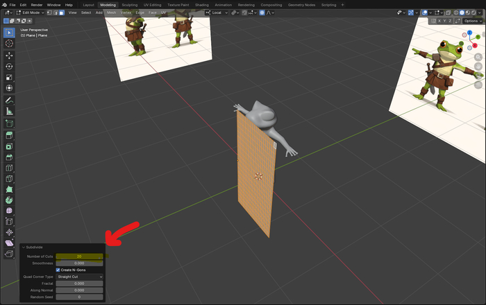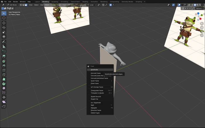 Длю (Ctrl+R) плоскость пополам, перехожу е Edit Mode (Tab\выпадающее меню), выделяю всю плоскость A и правой кнопкой мыши вызываю меню где выбираю Subdivide/