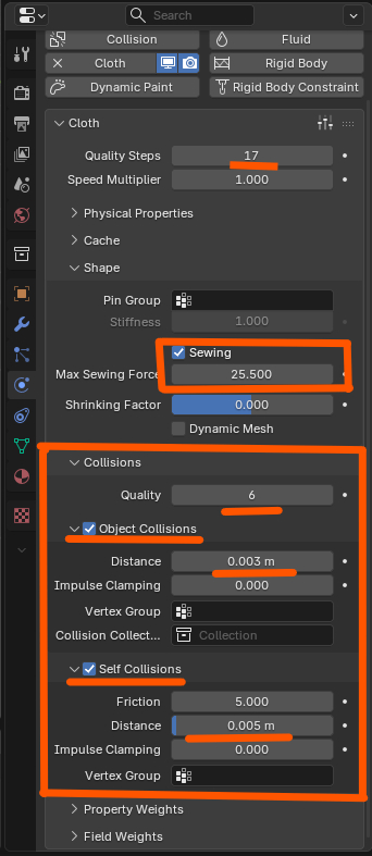 Во вкладке Collisions (столкновения) включаю Object Collisions, Self Collisions. Quality выбираю 6, Distance ставлю как .003 и .005. Это нужно чтобы ткань не проваливалась сквозь персонажа.