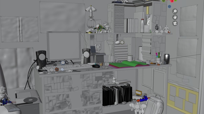 Так выглядит проект без текстур. Так как в работе над проектом я начал осваивать 3d моделирование, для быстрого выполнения я добавлял бесплатные готовые модели с сайта sketchfab. И мною созданных моделей в данном проекте 60%. Сейчас я доделываю модели , уменьшаю количество полигонов, дорабатываю текстуры, и по не многу осваиваю скульптинг.